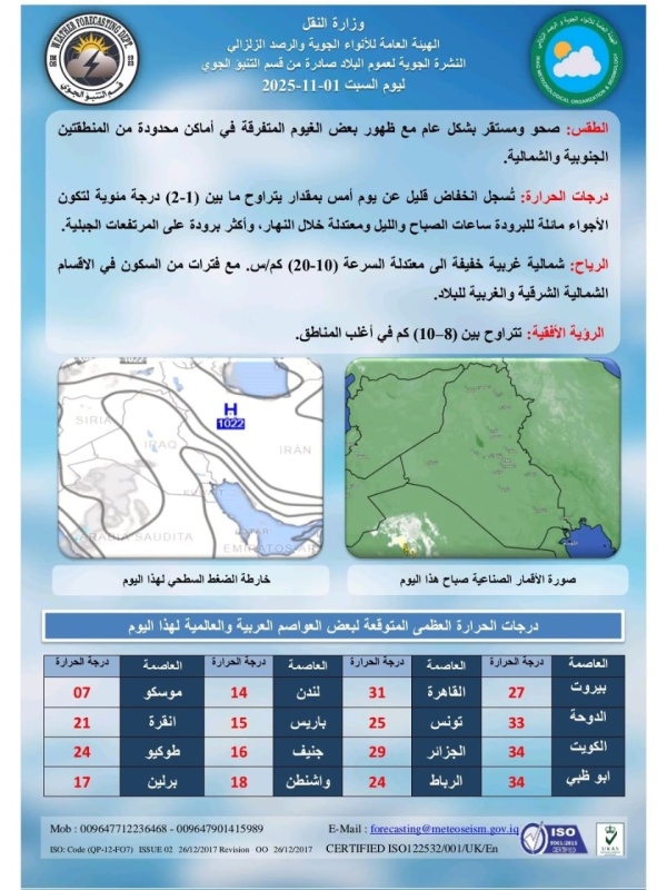 أكدت هيئة الأنواء الجوية، اليوم السبت (1 تشرين الثاني 2025)، أن أجواء البلاد ستكون صحوة ومستقرة بشكل عام، مع ظهور غيوم متفرقة في بعض مناطق الجنوب والشمال.