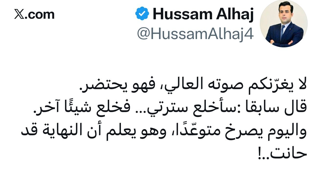 وقال الحاج في تغريدته التي تابعتها "بغداد اليوم" في إشارة واضحة للحلبوسي: "لا يغركم صوته العالي، فهو يحتضر. قال سابقًا: سأخلع سترتي... فخلع شيئًا آخر. واليوم يصرخ متوعدًا، وهو يعلم أن النهاية قد حانت."