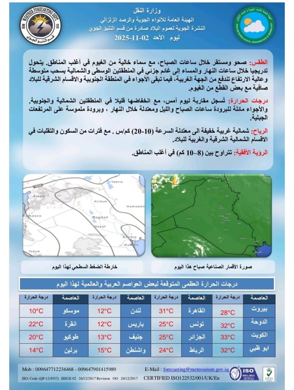 تتوقع الأرصاد الجوية في العراق، اليوم الاحد (2 تشرين الثاني 2025)، طقساً صحواً ومستقراً في معظم المناطق، مع غيوم جزئية في المنطقة الوسطى والشمالية خلال ساعات النهار والمساء. وتشهد درجات الحرارة انخفاضاً طفيفاً، لتكون الأجواء مائلة للبرودة صباحاً وليلاً، ومعتدلة نهاراً.