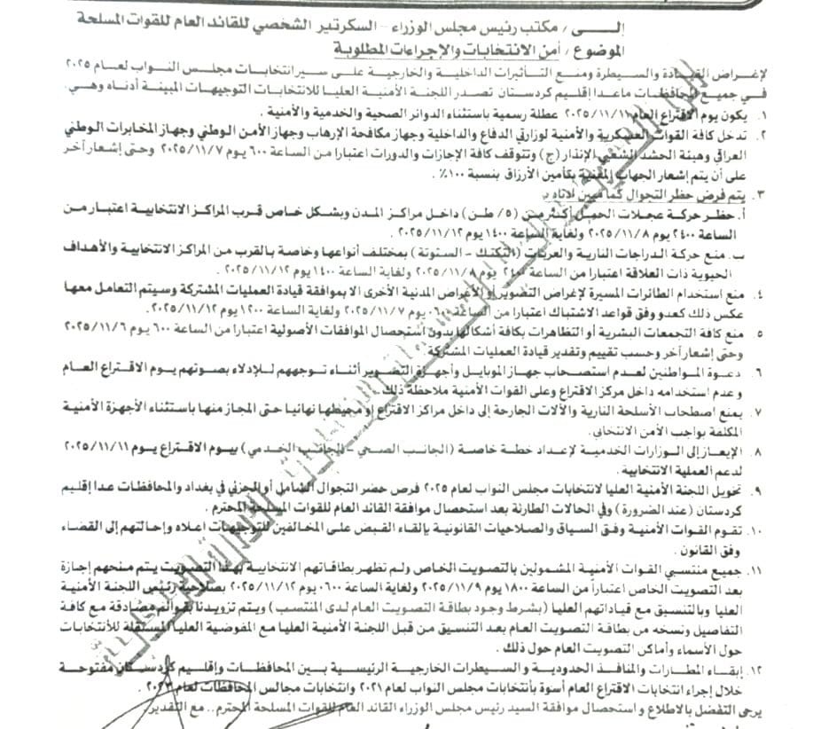 وأشارت الوثيقة، الصادرة عن اللجنة الأمنية العليا للانتخابات ولأغراض القيادة والسيطرة ومنع التأثيرات الداخلية والخارجية على سير العملية الانتخابية في جميع المحافظات ما عدا إقليم كردستان، إلى التوجيهات التالية: