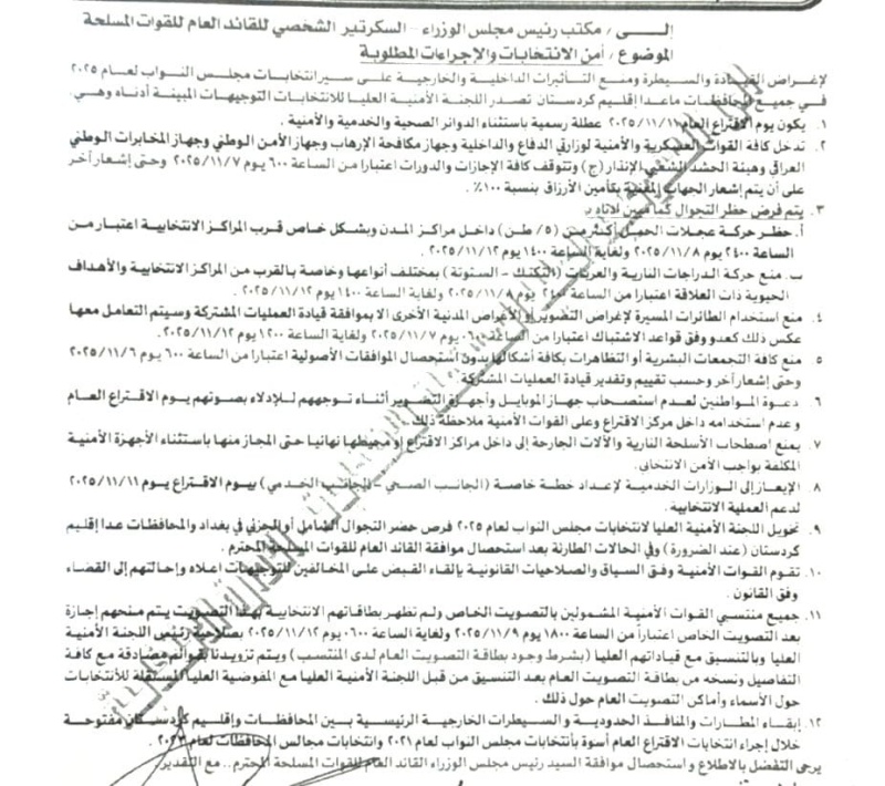 حصلت "بغداد اليوم" على وثيقة تشير إلى الإجراءات الأمنية المقرر اتخاذها في الانتخابات النيابية المقررة في 11 تشرين الثاني 2025.