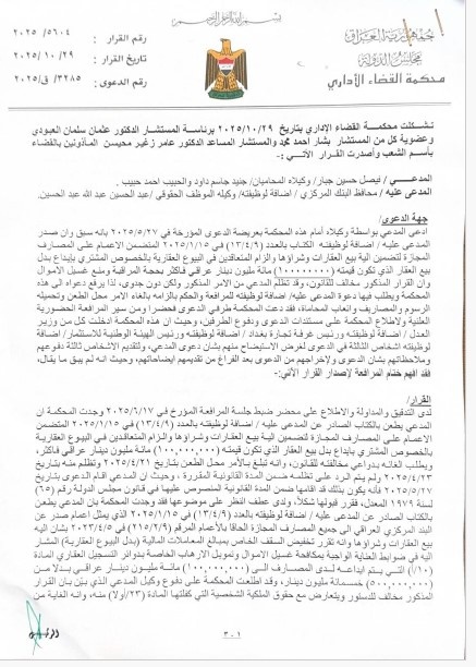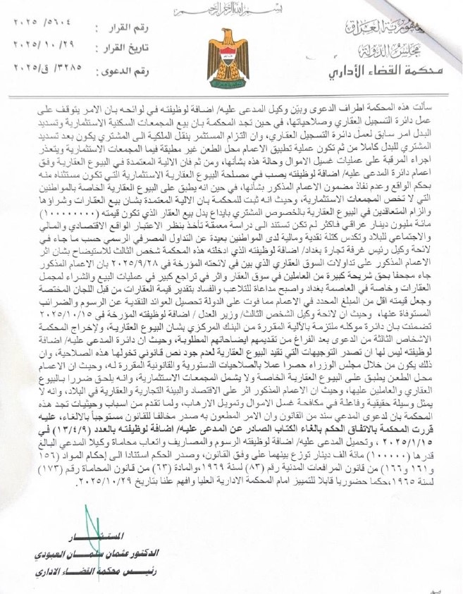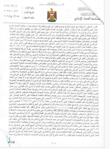 وذكرت المحكمة في منطوق القرار وبحسب وثائق حصلت عليها "بغداد اليوم"، اليوم الأحد (2 تشرين الثاني 2025)، إنها "قررت إلغاء الكتاب الصادر عن محافظ البنك المركزي العراقي المؤرخ في 9/4/2025 والمتضمن تقييد التعاملات المصرفية الخاصة بعمليات البيع العقاري، واعتبار تلك القيود باطلة لمخالفتها أحكام القانون والدستور".