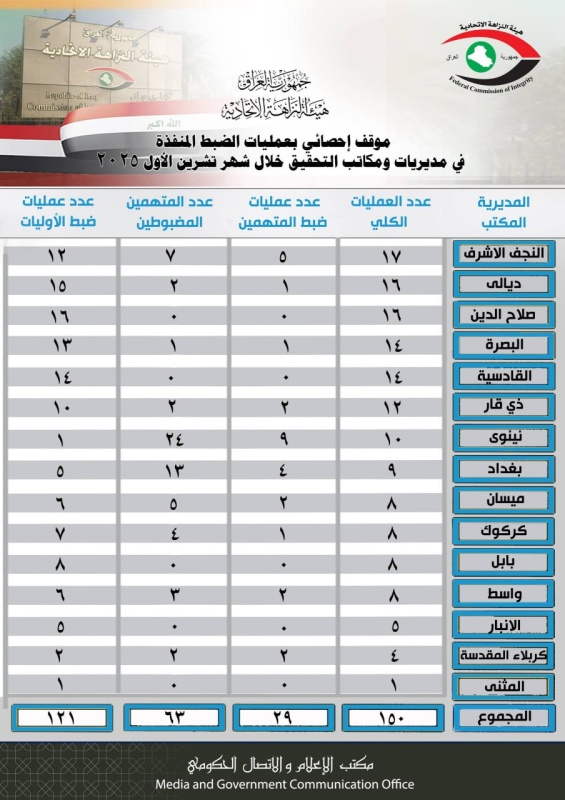 وذكر بيان للهيئة، تلقته "بغداد اليوم"، أن "الهيئة تنشر مجمل نشاطاتها خلال شهر تشرين الأول 2025"، مبينًا أن "عدد عمليات الضبط بلغ 121 عملية، وعدد المتهمين الذين تم ضبطهم بالجرم المشهود بلغ 63".