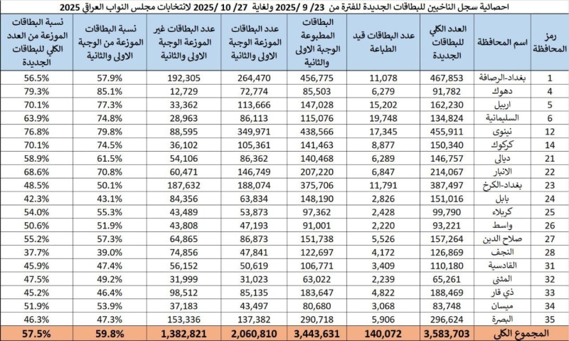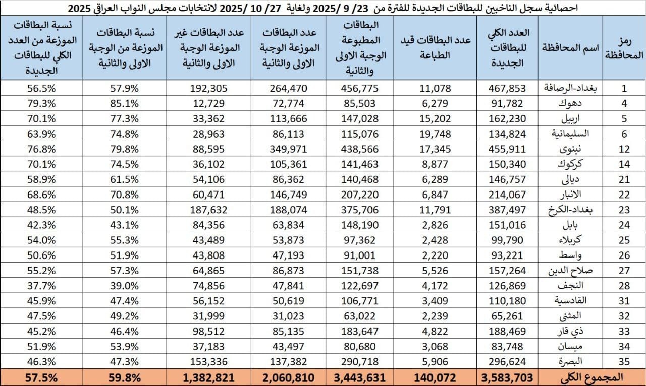 أعلنت المفوضية العليا المستقلة للانتخابات، اليوم الاحد (2 تشرين الثاني 2025)، عن إحصائية سجل الناخبين المحدث استعداداً للانتخابات المقبلة.