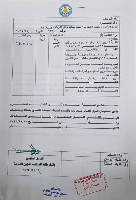 وبحسب كتاب من وكالة الوزارة لشؤون الشرطة، تلقته "بغداد اليوم"، اليوم الأحد، (2 تشرين الثاني 2025)، فقد تقرر استبدال زي شرطة النجدة الى الزي (النيلي) ابتداءً من 15 تشرين الثاني الجاري".
