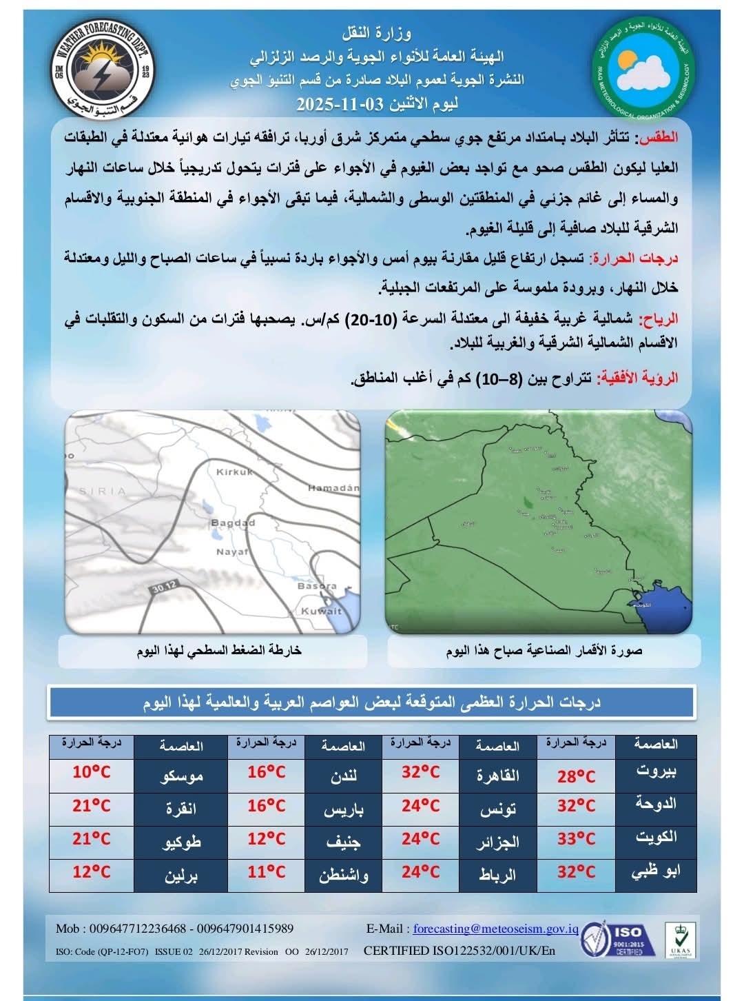 توقعت هيئة الأنواء الجوية، اليوم الاثنين (3 تشرين الثاني 2025)، أن تتأثر البلاد بامتداد مرتفع جوي سطحي متمركز شرق أوروبا، مما يسهم باستقرار الأجواء في أغلب المناطق، وتشير التوقعات إلى ظهور بعض الغيوم على فترات، لتتحول الأجواء تدريجياً إلى صافية أو قليلة الغيوم خلال ساعات النهار.