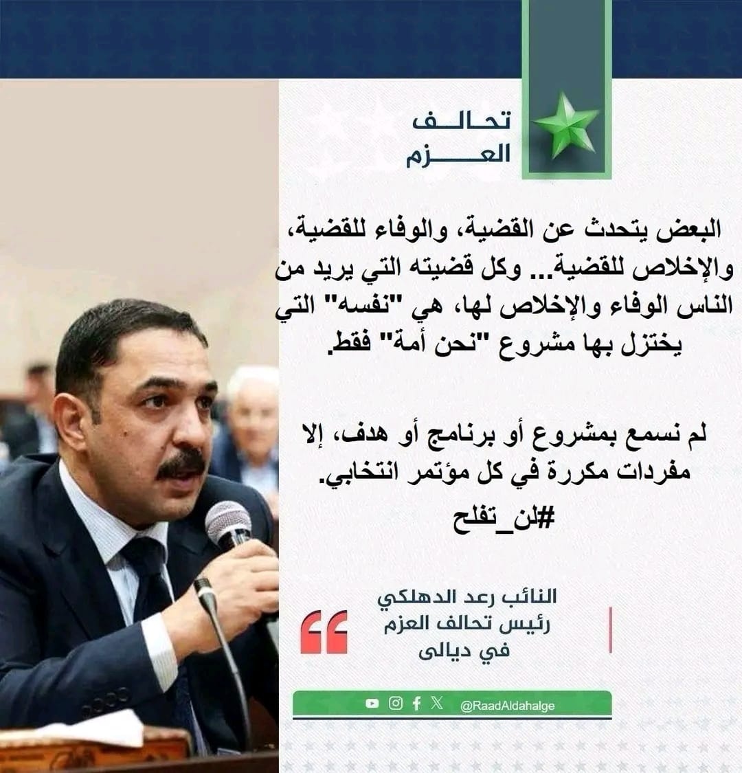 انتقد رئيس تحالف العزم بديالى رعد الدهلكي، اليوم الاثنين (3 تشرين الثاني 2025)، البرامج الانتخابية للسياسيين ولاسيما مشروع "نحن أمة".