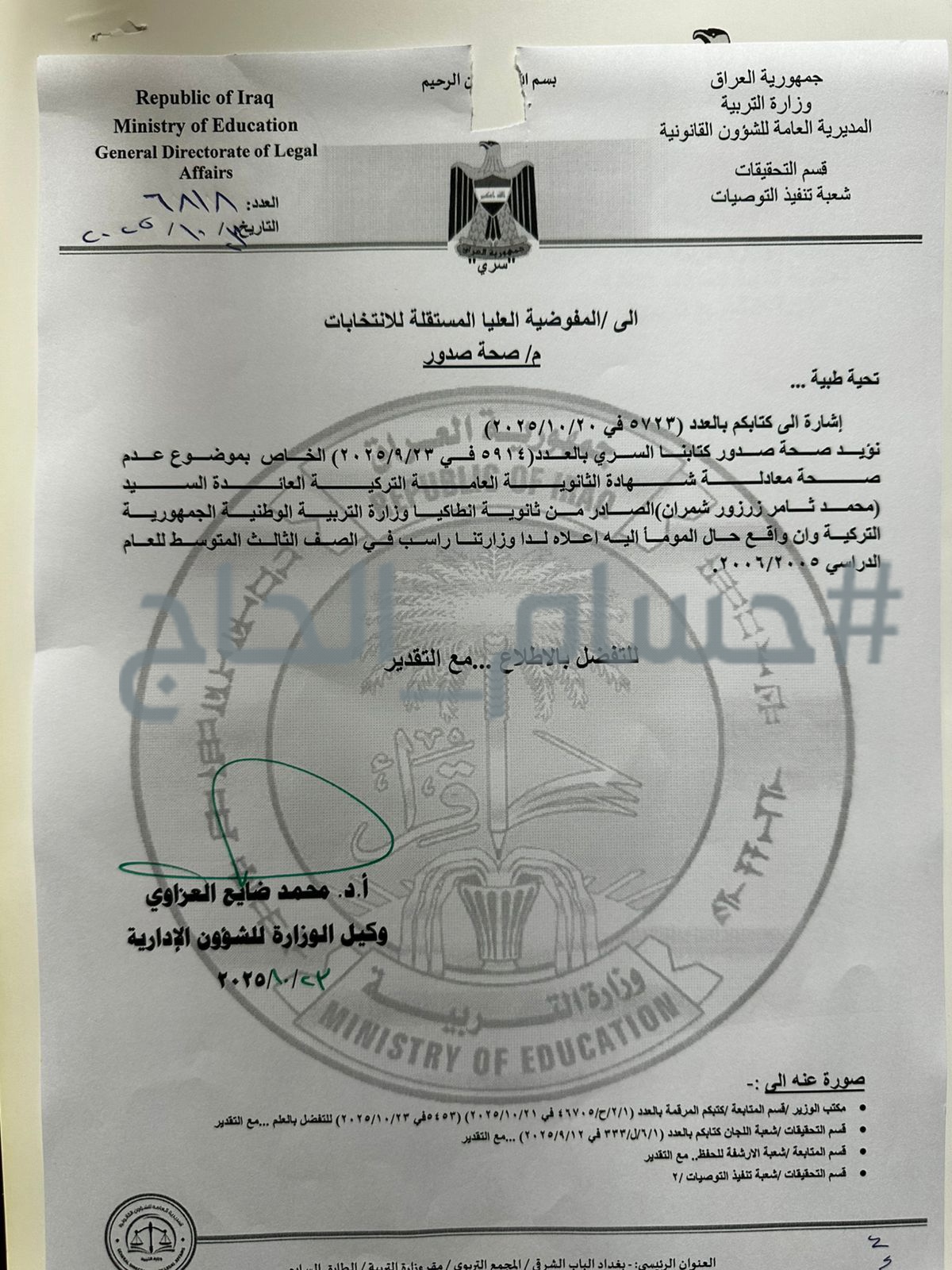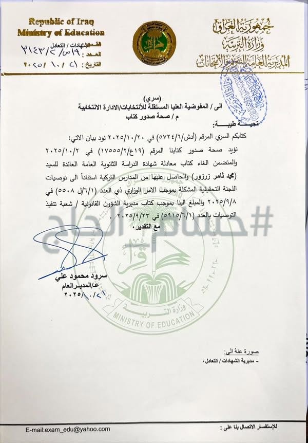 وذكرت الوثائق الصادرة من وزارة التربية بتاريخ 2025/10/21، "نؤيد صحة صدور كتابنا والمتضمن الغاء كتاب معادلة شهادة الدراسة الثانوية العامة العائدة لمحمد ثامر زرزور والحاصل عليها من المدارس التركية استناداً الى توصيات اللجنة التحقيقية المشكلة والمبلغ الينا بموجب كتاب مديرية الشؤون القانونية / شعبة تنفيذ التوصيات بالعدد (5915/6/1) في 2025/9/23".