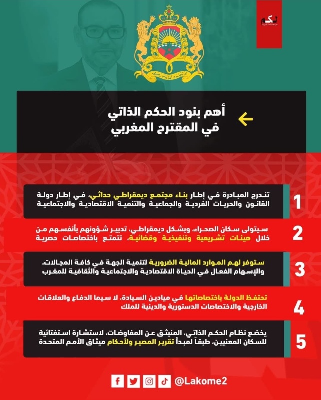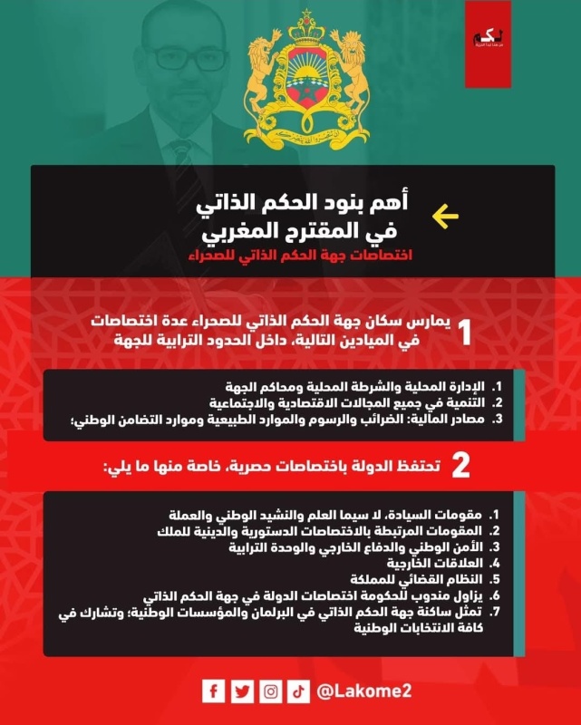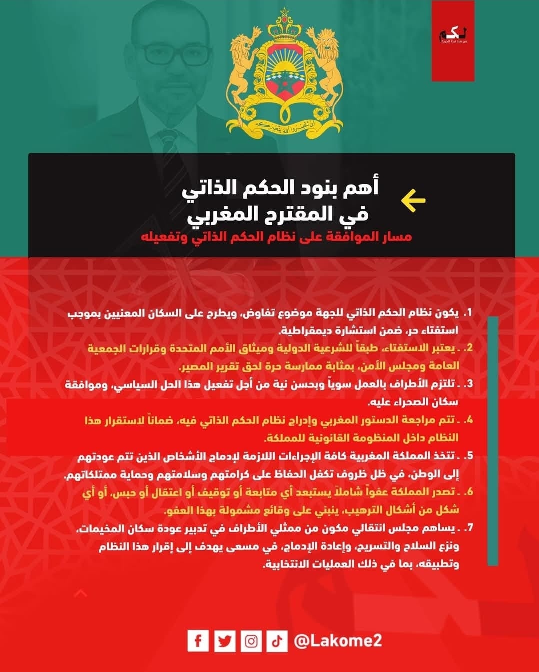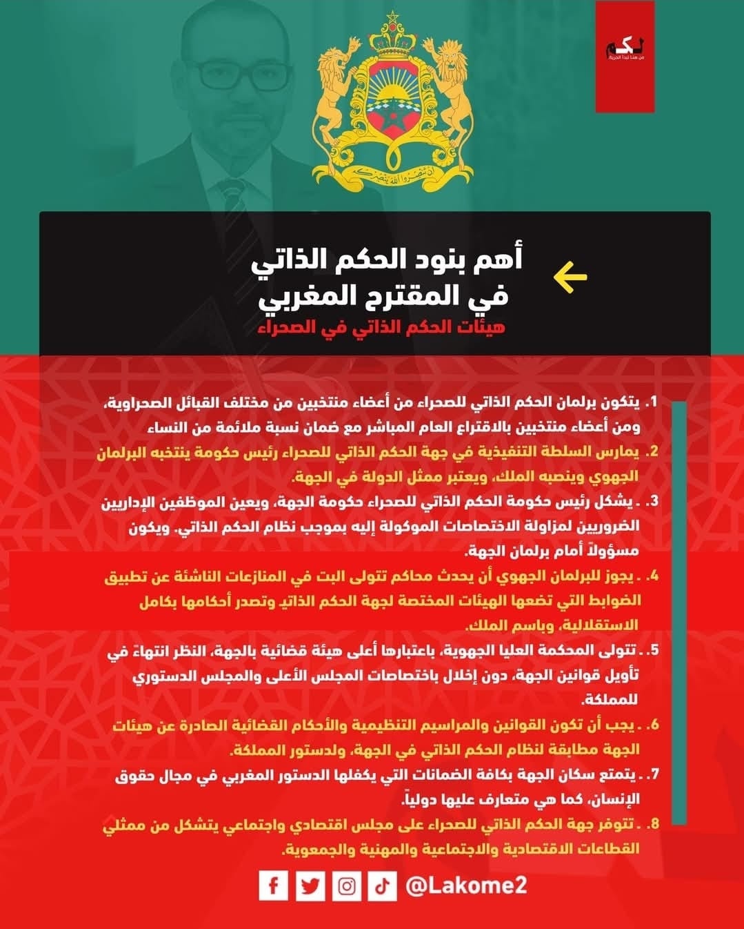 نشرت مصادر مغربية، اليوم الاثنين (3 تشرين الثاني 2025)، أبرز بنود مقترح الحكم الذاتي الذي تقدمت به المملكة المغربية، والمتعلق بتنظيم اختصاصات جهة الحكم الذاتي في الصحراء وآلية ممارسة سلطاتها ضمن السيادة الوطنية للمملكة.