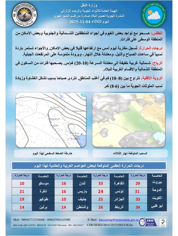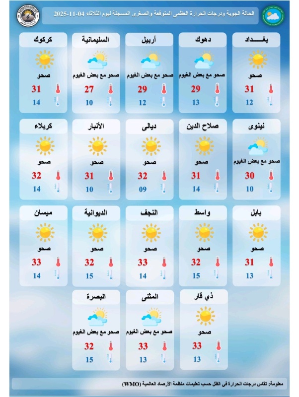 تشير توقعات الطقس في العراق، اليوم الثلاثاء (4 تشرين الثاني 2025)، إلى أن اجواء البلاد تكون صحوة مع تواجد بعض الغيوم في المنطقتين الشمالية والجنوبية وبعض مناطق الوسط على فترات متقطعة، بينما ترتفع درجات بشكل طفيف في بعض المناطق، فيما تستمر الأجواء باردة نسبياً خلال ساعات الصباح والليل، ومعتدلة أثناء النهار.