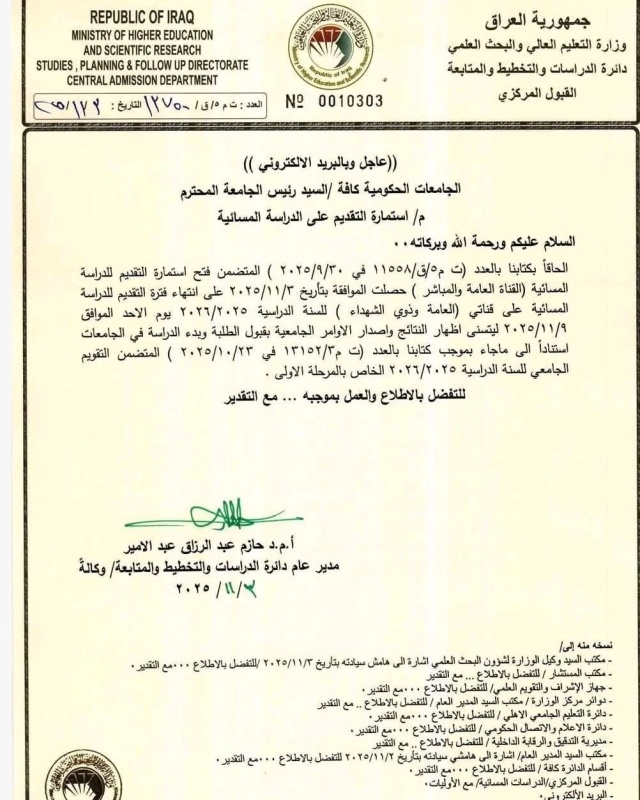حددت وزارة التعليم العالي والبحث العلمي، موعد إغلاق استمارة التقديم على الدراسة المسائية في الجامعات الحكومية.