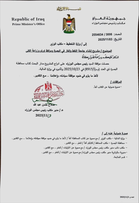 واشارت وثيقة صادرة من مجلس الوزراء بتاريخ (2025/11/3)، وحصلت "بغداد اليوم" على نسخة منها الى "موافقة رئيس مجلس الوزراء على ادراج المشروع مدار البحث كتاب محافظة البصرة ذي العدد (م.م/8915/1) في 2025/10/23 وتأشيره في وزارة المالية".