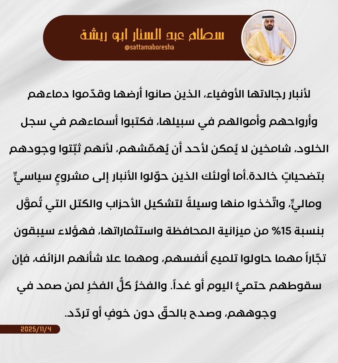 واضاف "أما أولئك الذين حوّلوا الأنبار إلى مشروع سياسي ومالي، واتخذوا منها وسيلة لتشكيل الأحزاب والكتل التي تُموّل بنسبة 15% من ميزانية المحافظة واستثماراتها، فهؤلاء سيبقون تجاراً مهما حاولوا تلميع أنفسهم، ومهما علا شأنهم الزائف، فإن سقوطهم حتمي اليوم أو غداً".