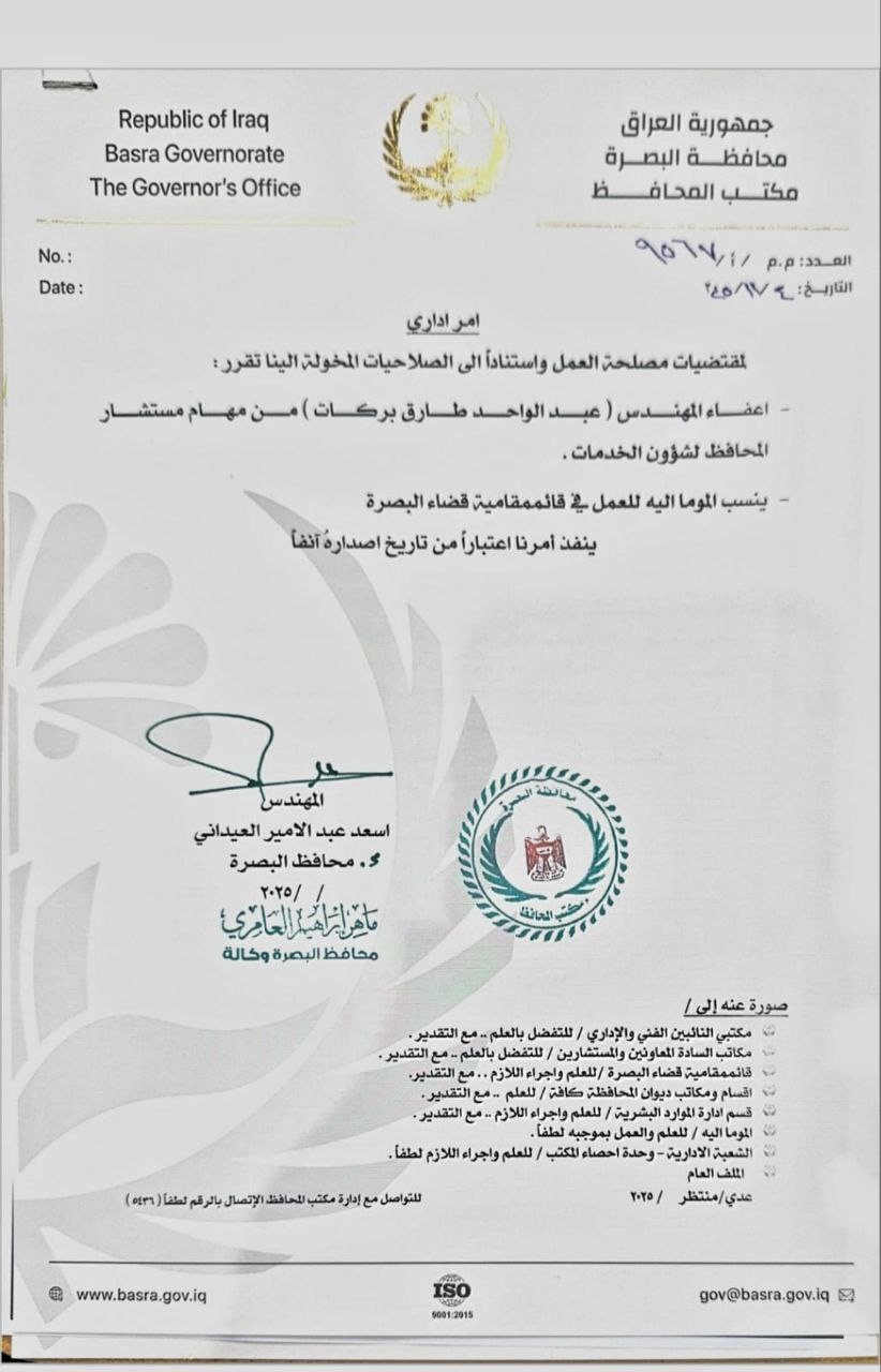 أصدر مكتب محافظ البصرة اسعد العيداني، اليوم الثلاثاء (4 تشرين الثاني 2025)، أمرًا إداريًا يقضي بنقل عبد الواحد طارق بركات، مستشار المحافظ للشؤون الخدمية، إلى العمل في قائممقامية قضاء البصرة.