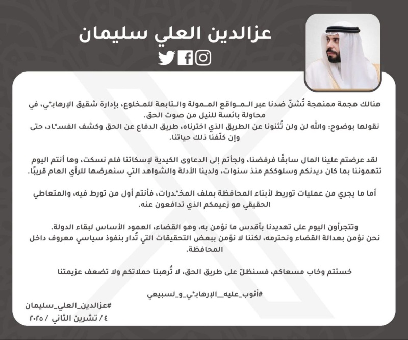 أكد الأمين العام لحزب تجمع من أجل الديمقراطية العراقي عزالدين العلي سليمان، اليوم الثلاثاء (4 تشرين الثاني 2025)، أن الهجمة الممنهجة التي تُشن ضده عبر مواقع التواصل الممولة والتابعة للمخلوع، بإدارة شقيق الإرهابي، لن تثنيه عن مواصلة طريق الدفاع عن الحق وكشف الفساد، مهما كلفه ذلك.