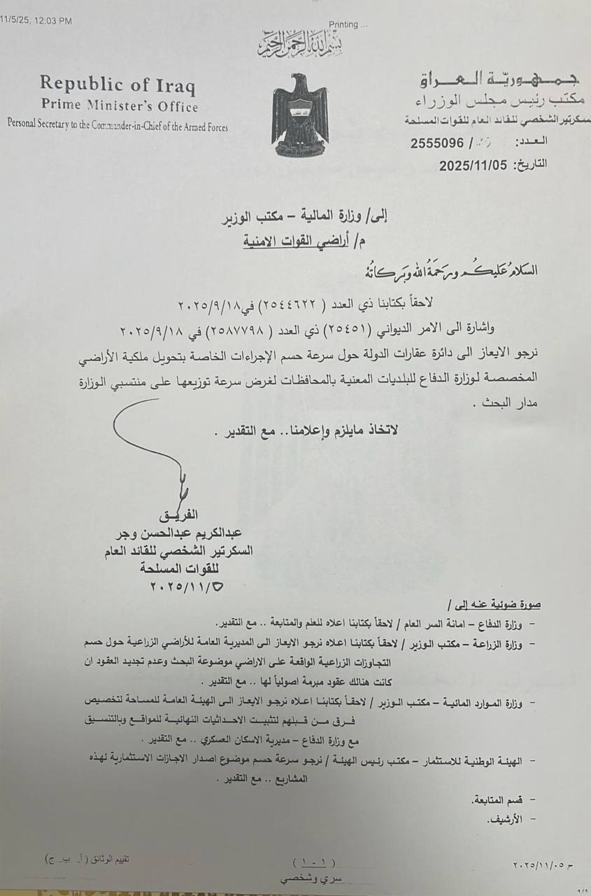 خاطب مكتب القائد العام للقوات المسلحة، اليوم الأربعاء، (5 تشرين الثاني 2025) وزارة المالية لحسم الاجراءات الخاصة بتحويل ملكية الاراضي المخصصة لوزارة الدفاع للبلديات المعنية بالمحافظات لغرض توزيعها على منتسبي الوزارة.