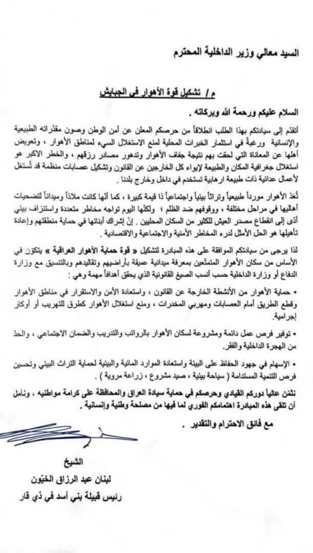 وتابع: "لذا، يُرجى منكم الموافقة على هذه المبادرة لتشكيل قوة حماية الأهوار العراقية يتكون في الأساس من سكان الأهوار المتمتعين بمعرفة ميدانية عميقة بأراضيهم وتقاليدهم، وبالتنسيق مع وزارة الدفاع أو وزارة الداخلية حسب أنسب الصيغ القانونية، والذي يحقق أهدافاً مهمة".
