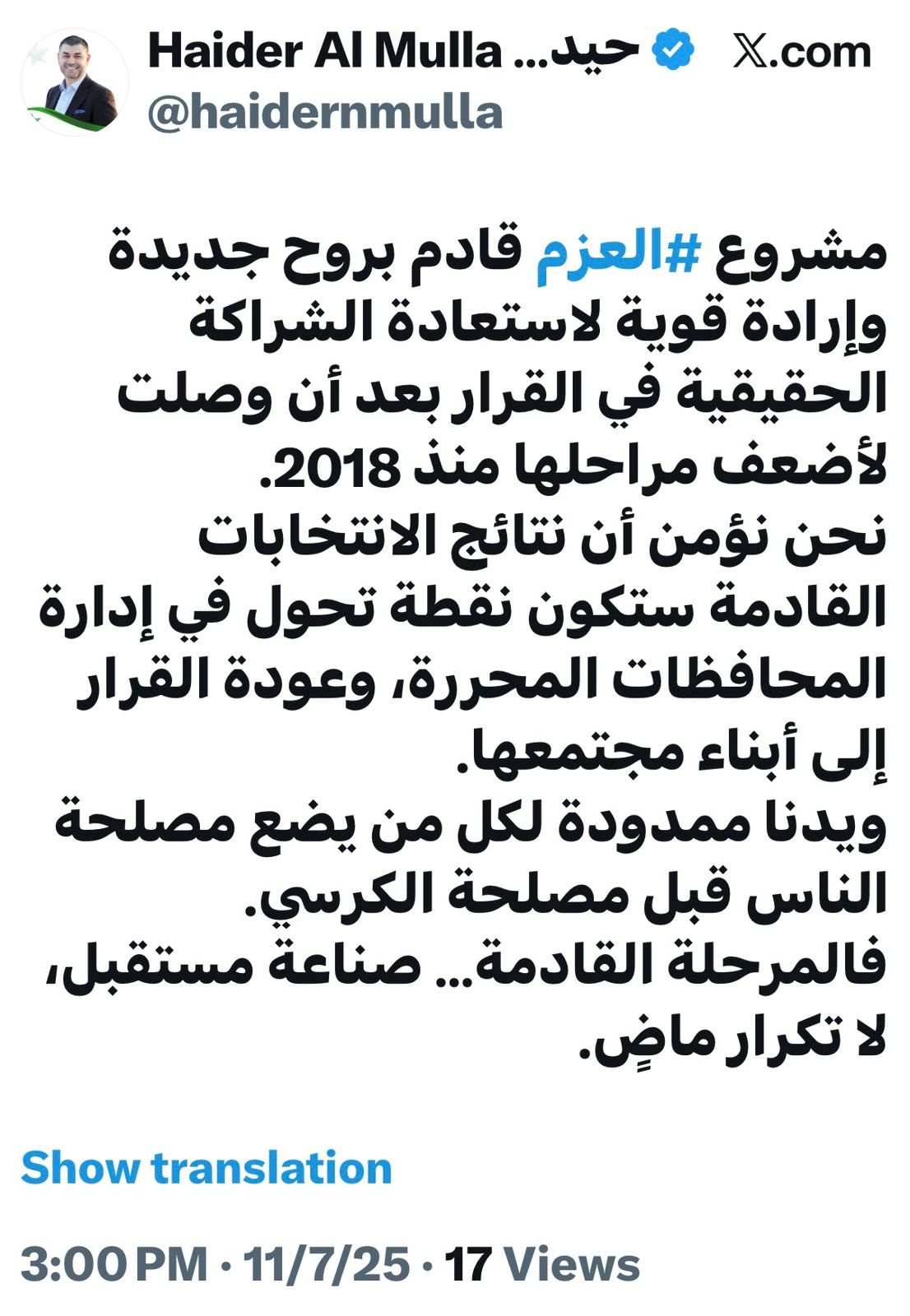 وأضاف: "نؤمن أن نتائج الانتخابات القادمة ستكون نقطة تحول في إدارة المحافظات المحررة وعودة القرار إلى أبناء مجتمعها"، مؤكداً أن "التحالف يمد يده لكل من يضع مصلحة الناس قبل مصلحة الكرسي".