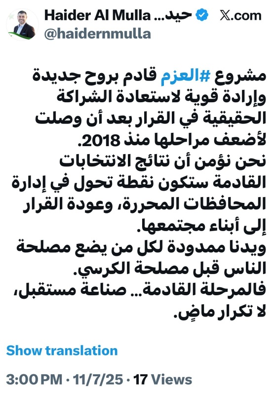 وختم الملا بالقول: "المرحلة القادمة هي لصناعة مستقبل جديد... لا لتكرار الماضي".