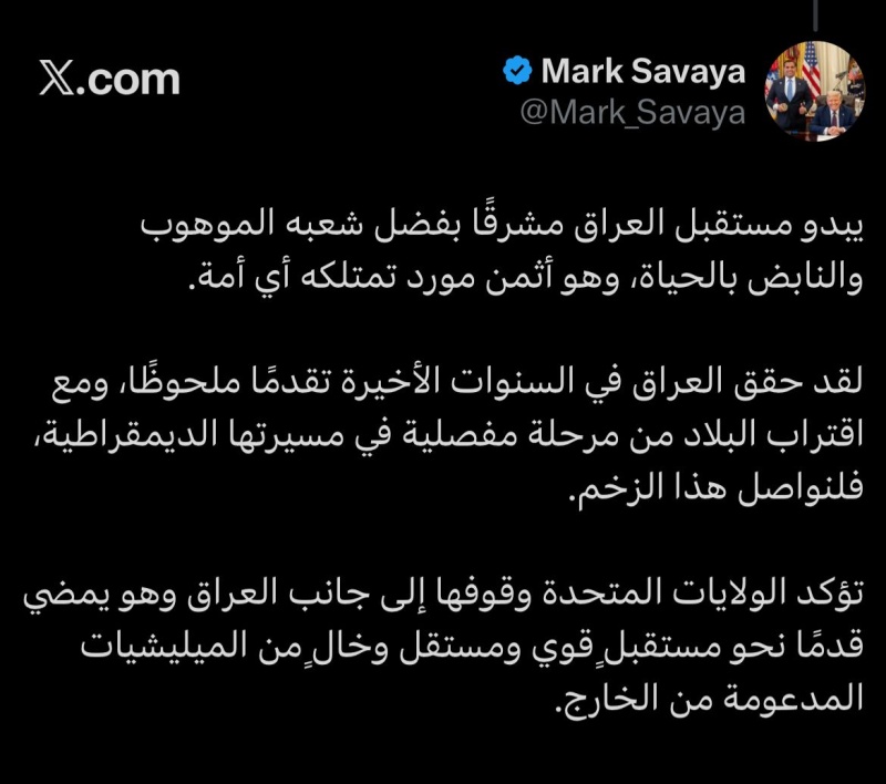 وأضاف سافايا في منشور عبر منصة "إكس"، تابعته "بغداد اليوم"، أن "العراق حقق في السنوات الأخيرة تقدمًا ملحوظًا، ومع اقتراب البلاد من مرحلة مفصلية في مسيرتها الديمقراطية، فلنواصل هذا الزخم".