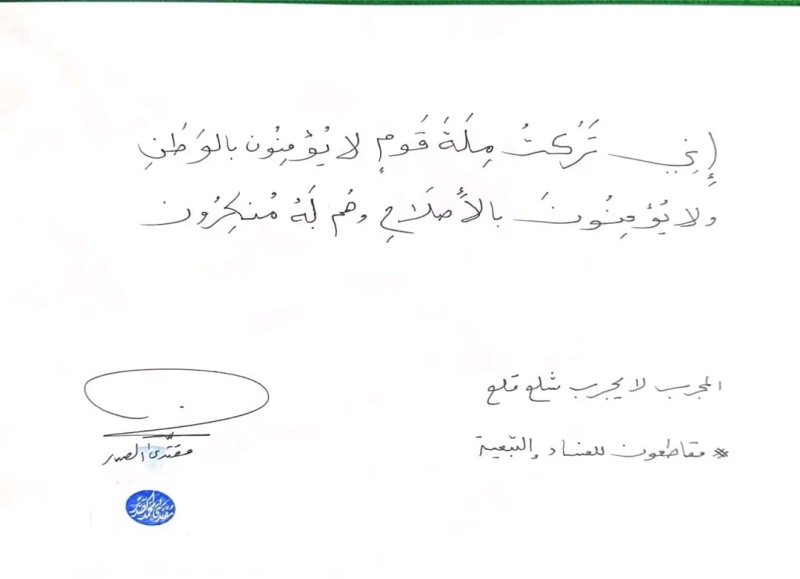 وذكر الصدر في تغريدة تابعتها "بغداد اليوم"، : "إِني تَرَكتُ مِلَةَ قَومٍ لا يُؤْمِنُونَ بِالوَطنِ ولا يؤمنون بالأصلاح وهم له منكرون".