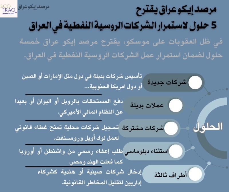 اقترح مرصد "إيكو عراق"، اليوم الأربعاء (12 تشرين الثاني 2025)، خمسة حلول أمام الحكومة العراقية لضمان استمرار عمل شركتي لوك أويل وروسنفت الروسيتين في العراق، في ظل المخاوف من توقف نشاطهما نتيجة العقوبات الدولية.