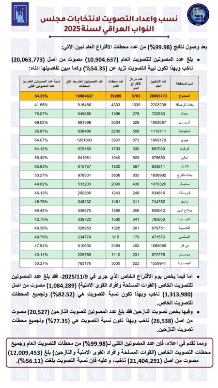 أكدت المفوضية العليا المستقلة للانتخابات، اليوم الأربعاء (12 تشرين الثاني 2025)، أنها ستعلن النتائج الأولية لانتخابات مجلس النواب 2025 مساء اليوم، عبر مؤتمر رسمي، مشيرة إلى أن الإعلان سيشمل نسب وأعداد الأصوات التي حصلت عليها التحالفات والأحزاب والقوائم المنفردة في كل محافظة على حدة.