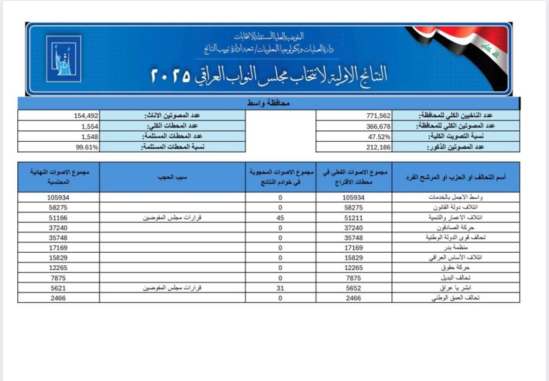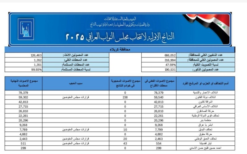 أعلنت المفوضية العليا المستقلة للانتخابات، اليوم الأربعاء (12 تشرين الثاني 2025)، النتائج الأولية للانتخابات البرلمانية في عموم البلاد، مؤكدة أن عمليات العد والفرز اليدوي جاءت مطابقة للنتائج الإلكترونية بنسبة 99.93 بالمئة.