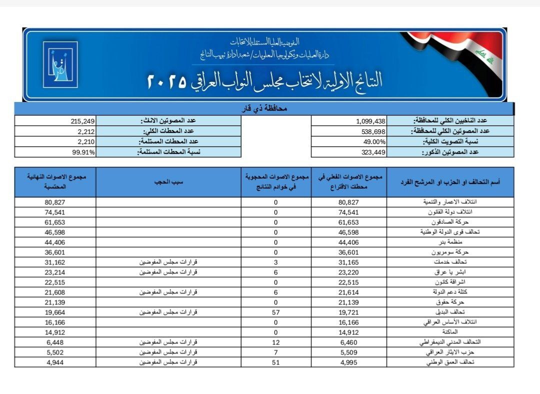 أعلنت المفوضية العليا المستقلة للانتخابات، اليوم الأربعاء (12 تشرين الثاني 2025)، النتائج الأولية للانتخابات البرلمانية في عموم البلاد، مؤكدة أن عمليات العد والفرز اليدوي جاءت مطابقة للنتائج الإلكترونية بنسبة 99.93 بالمئة.