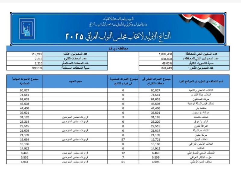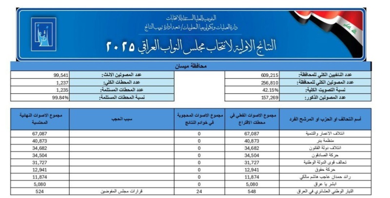 وأظهرت النتائج الأولية، التي أعلنتها المفوضية في مؤتمر صحفي تابعته "بغداد اليوم"، لمحافظتي ميسان وذي قار، ما يلي: