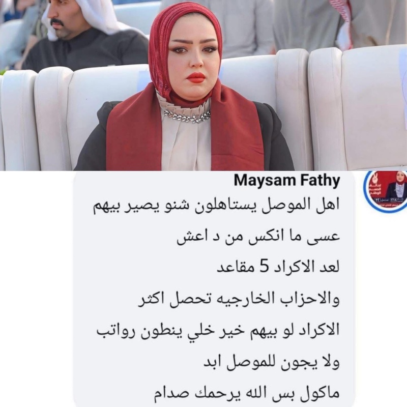 وتناقلت مواقع التواصل الاجتماعي في الاونة الاخيرة تدوينة للمرشحة عن تحالف الحسم ميسم فتحي البجاري تهاجم فيها اهالي محافظة نينوى، معربة عن غضبها واستيائها من نتائج الانتخابات بالمحافظة.