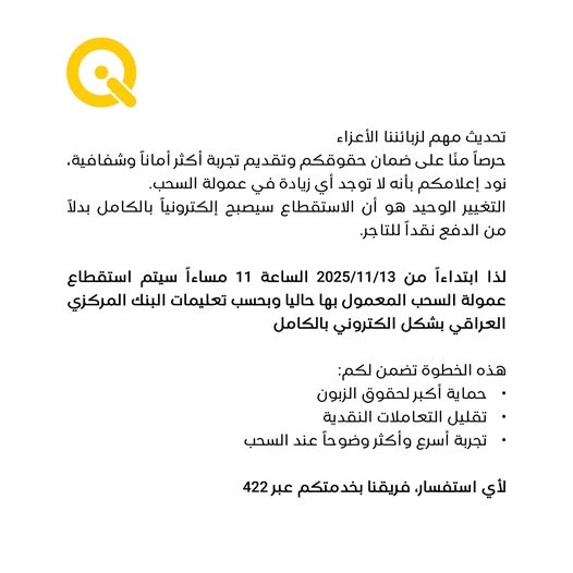 وذكرت الشركة، في بلاغ لعملائها، تلقته "بغداد اليوم"، أن "التغيير الوحيد يكمن في تحويل آلية استقطاع عمولة السحب إلى شكل إلكتروني بالكامل، ليحل بذلك محل الدفع النقدي الذي كان يتم للتاجر".