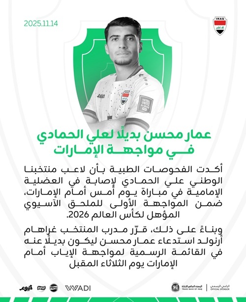 أعلن الاتحاد العراقي لكرة القدم، اليوم الجمعة، (14 تشرين الثاني 2025)، عن غياب مهاجم المنتخب الوطني، علي الحمادي عن مباراة العراق والإمارات في إياب الملحق الآسيوي المؤهل لكأس العالم 2026 بسبب الإصابة.