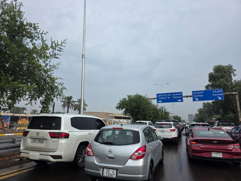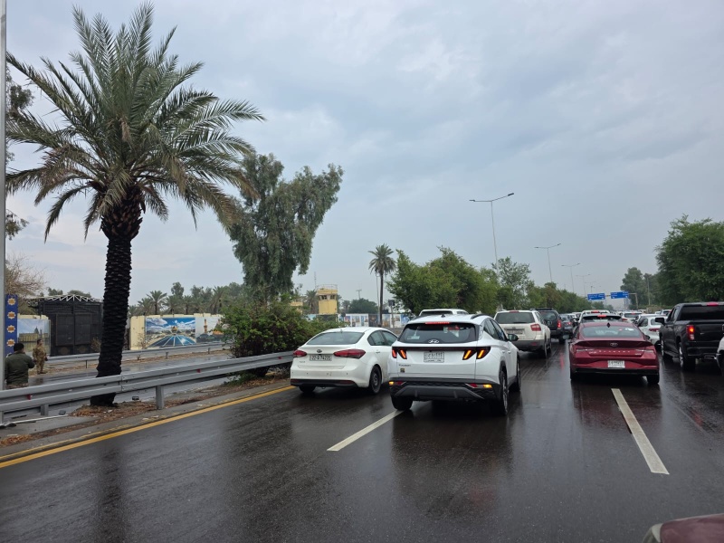 شهد مدخل المنطقة الخضراء من جهة مطار بغداد الدولي، اليوم السبت (15 تشرين الثاني 2025)، توقفاً شبه تام لحركة السير نتيجة تجمع مياه الأمطار وارتفاع منسوبها في عدد من الطرق.
