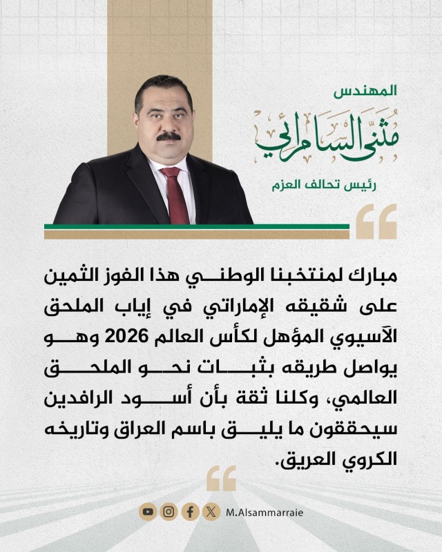 هنأ رئيس تحالف العزم مثنى السامرائي، مساء اليوم الثلاثاء (18 تشرين الثاني 2025)، بفوز المنتخب الوطني على نظيره الاماراتي في مباراة إياب الملحق الآسيوي المؤهل إلى التصفيات النهائية لكأس العالم 2026.