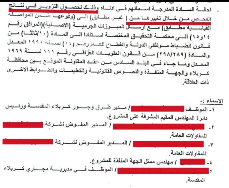 وكتب المطيري في تدوينة تابعتها "بغداد اليوم" إنه "بعد ثبوت التزوير في نتائج الفحص وتغييره تم احالة المديران المفوضان للشركتين المتعاقد معهما في تنفيذ مجسر الحسينية وكذلك المهندس المقيم والمهندس الممثل للجهة المنفذة وأحد الموظفين المتورطين الى المحاكم المختصة بتهمة التزوير".