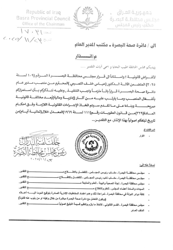 وجه مجلس محافظة البصرة إنذاراً رسمياً إلى مدير عام دائرة صحة البصرة، عباس خلف التميمي، مؤكداً أن استمرار شغله للمنصب بعد قرار إقالته يُعد مخالفة قانونية صريحة.