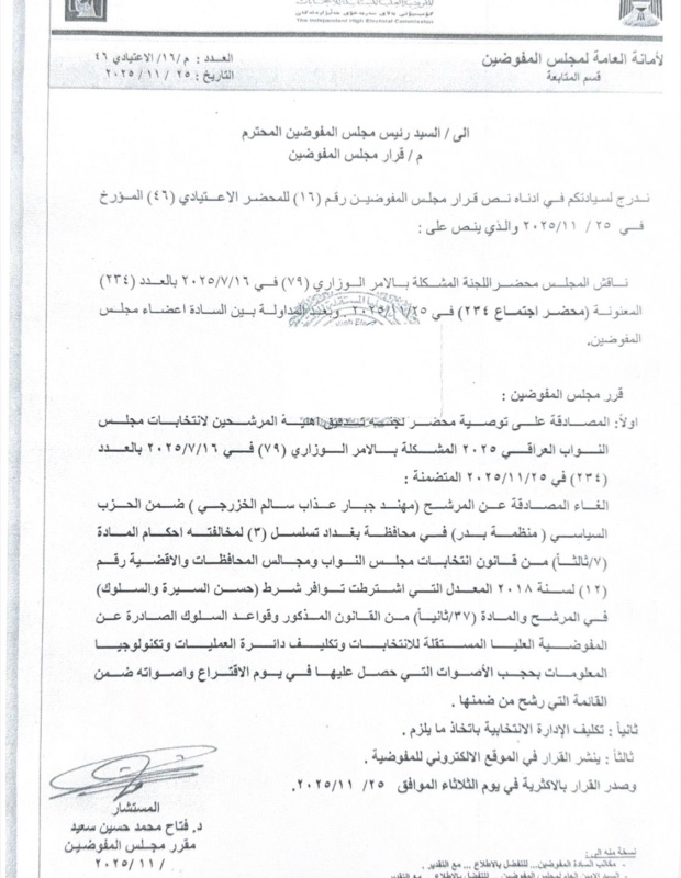 أظهرت وثيقة صادرة عن المفوضية العليا المستقلة للانتخابات بتاريخ، اليوم الثلاثاء (25 تشرين الثاني 2025)، قرارا يقضي باستبعاد المرشح الفائز "مهند الخزرجي" بانتخابات تشرين 2025 لعدم توفر شرط "حسن السيرة والسلوك".