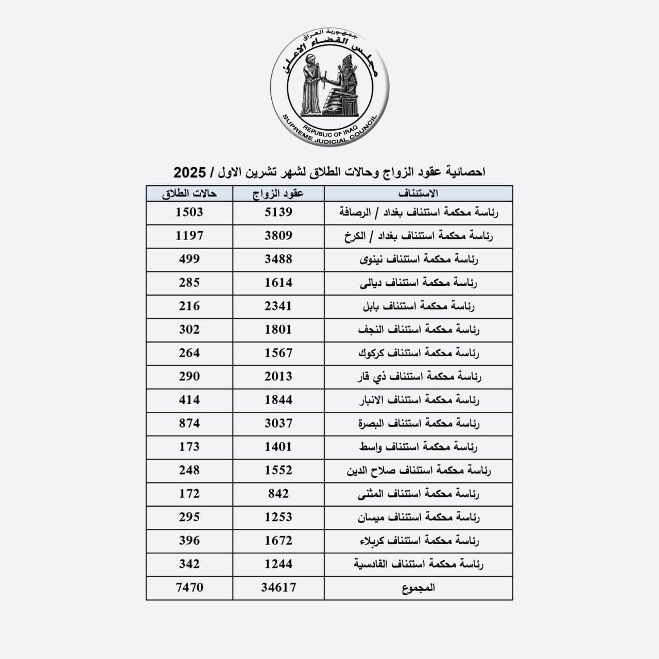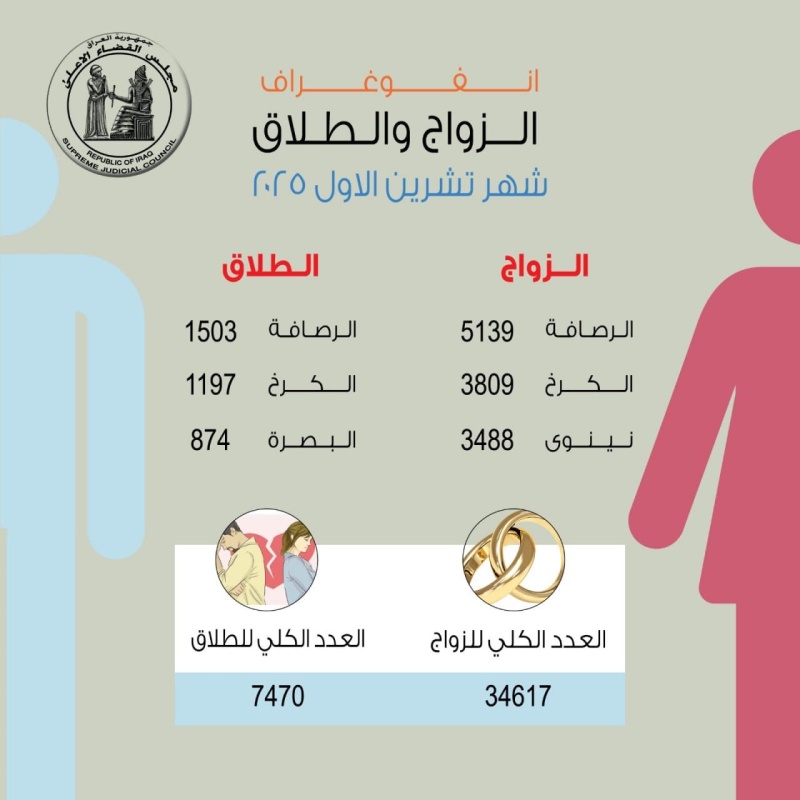 أعلن مجلس القضاء، اليوم الأربعاء ( 26 تشرين الثاني 2025 )، إحصائية الزواج والطلاق لشهر تشرين الأول الماضي لعام 2025.