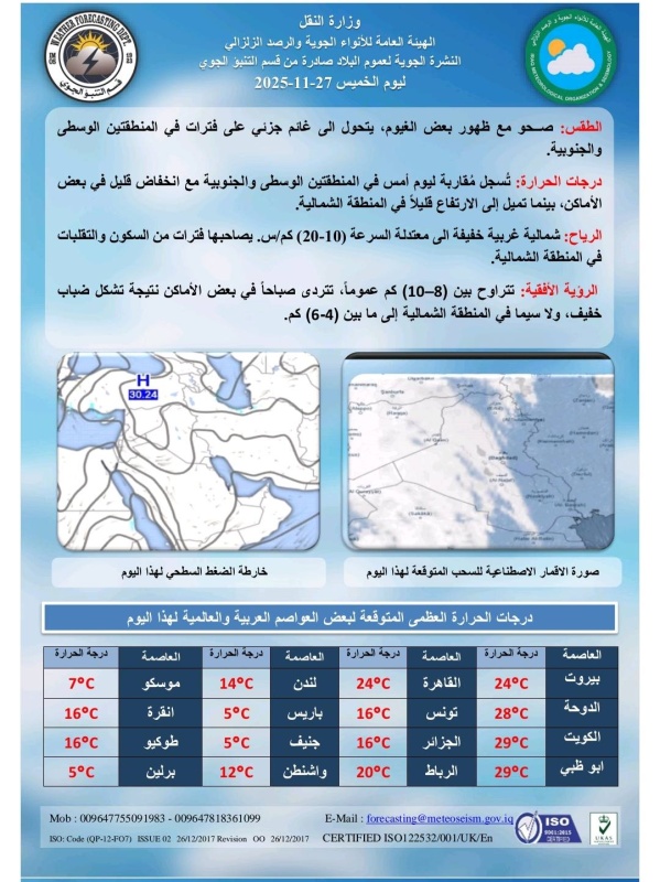 تشير توقعات الطقس في العراق، اليوم الخميس ( 27 تشرين الثاني 2025 )، الى أن الأجواء تكون صحوة مع ظهور بعض الغيوم، حيث تتحول الى غائمة جزئيا على فترات في المنطقتين الوسطى والجنوبية، بينما تسجل درجات الحرارة مقاربة ليوم أمس في المنطقتين الوسطى والجنوبية مع انخفاض قليل في بعض الأماكن، الا انها تميل إلى الارتفاع قليلاً في المنطقة الشمالية.