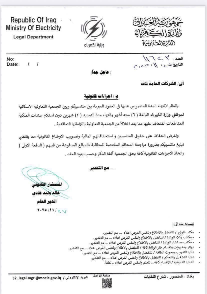 أفاد عدد من موظفي وزارة الكهرباء، اليوم الخميس (27 تشرين الثاني 2025)، بأن الوزارة وجّهتهم رسمياً باتخاذ الإجراءات القانونية اللازمة وتقديم دعاوى مدنية وجزائية ضد جمعية إسكان موظفي الكهرباء ورئيسها مصعب المدرّس، بعد ما اعتبروه "إخلالاً واضحاً" بالتزامات الجمعية تجاه مشروع الأراضي السكنية وعدم إرجاع المبالغ المودعة في المصارف منذ عام 2021. وأكد الموظفون أن توجيه الوزارة جاء بعد تصاعد الاحتجاجات داخل مبنى الوزارة واعتصام العشرات للمطالبة بكشف مصير الأموال وآلية إدارتها.
