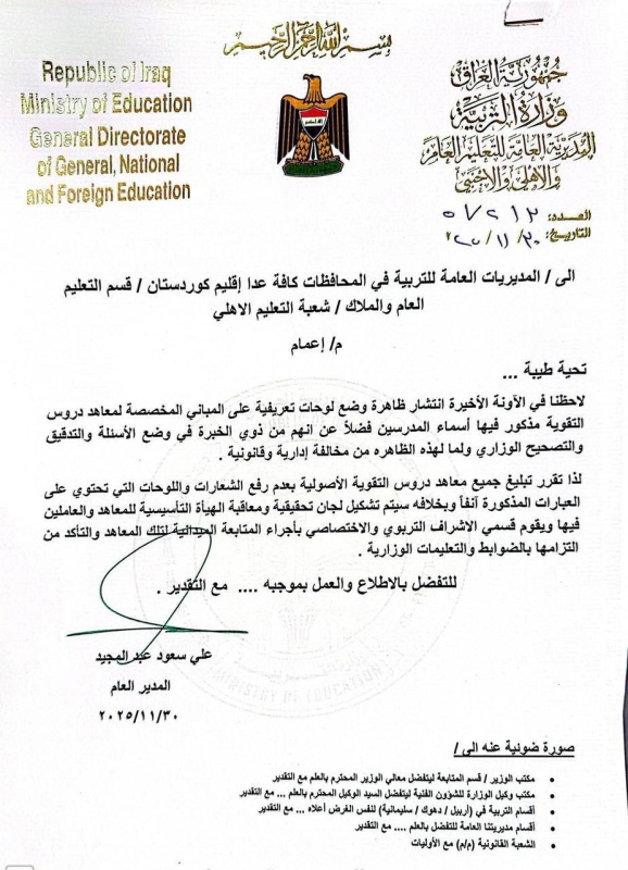 وبحسب اعمام للتربية، تلقته "بغداد اليوم"، وجهت فيه "جميع المديريات العامة للتربية في المحافظات عدا إقليم كردستان، باتخاذ إجراءات صارمة بحق المعاهد الأهلية المخالفة للضوابط والتعليمات الوزارية".