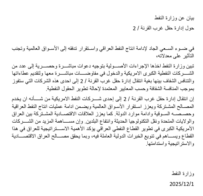 أعلنت وزارة النفط، اليوم الإثنين، ( 1 كانون الأول 2025 )، عن أخذها الإجراءات الأصولية لنقل إدارة حقل غرب القرنة / 2 إلى إحدى الشركات النفطية الكبرى الأمريكية، مؤكدة أن هذه الخطوة تهدف إلى إدامة الإنتاج وتعزيز استقرار الأسواق العالمية.