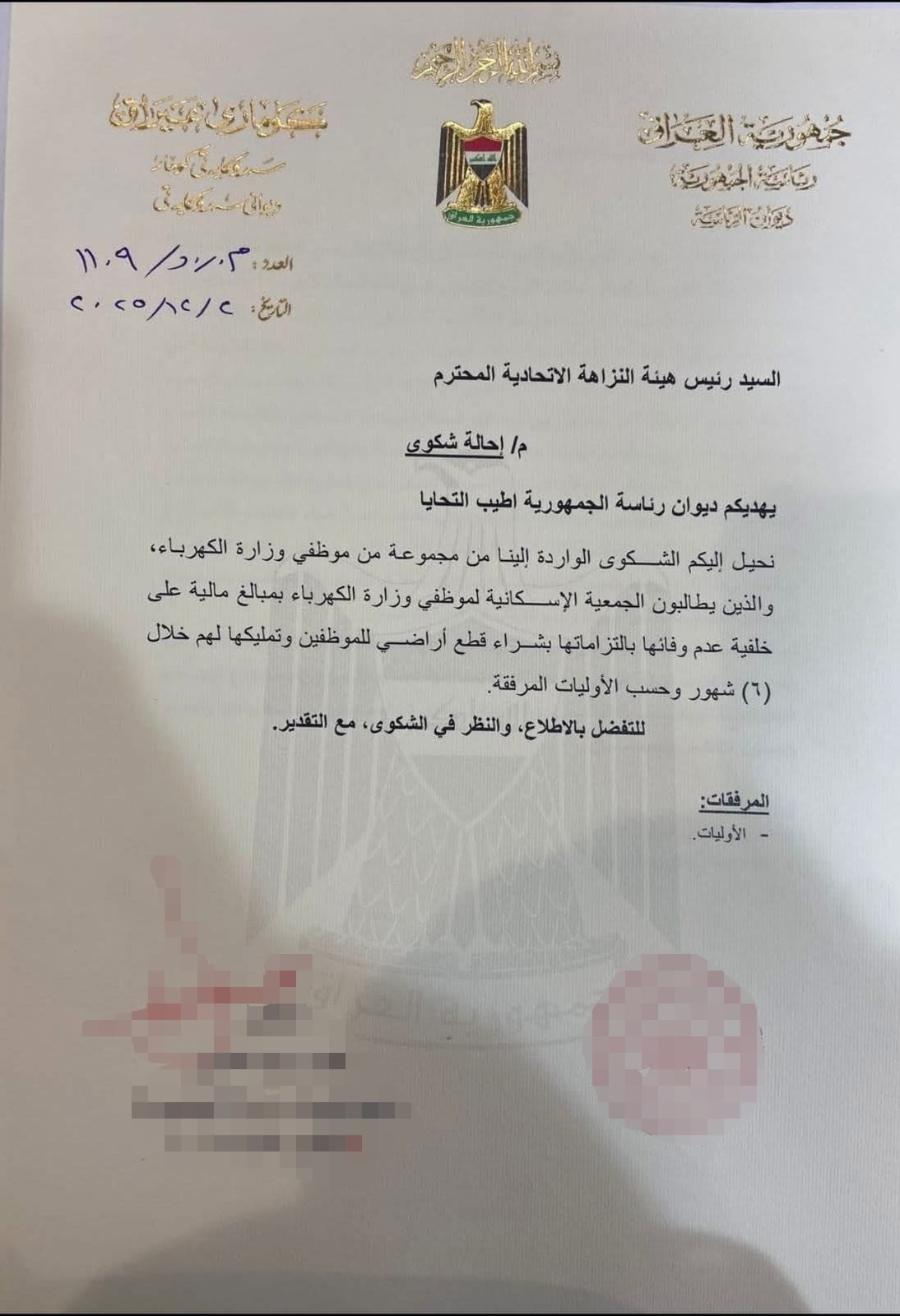 حصلت "بغداد اليوم" على وثيقة رسمية صادرة من رئاسة الجمهورية موجّهة إلى هيئة النزاهة، تتعلق بشكوى مقدّمة من مجموعة من موظفي وزارة الكهرباء ضد الجمعية الإسكانية الخاصة بموظفي الوزارة، على خلفية مبالغ مالية دفعها الموظفون مقابل قطع أراضٍ لم تُسلّم منذ أكثر من ثلاث سنوات.