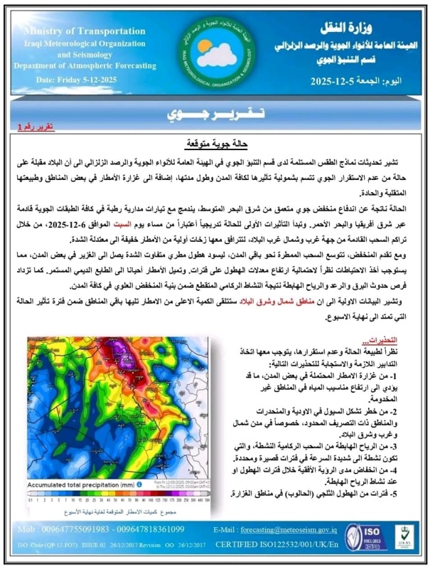 أعلن قسم التنبؤ الجوي في الهيئة العامة للأنواء الجوية والرصد الزلزالي، اليوم الجمعة (5 كانون الأول 2025)، أن البلاد مقبلة على حالة جوية فعّالة تمتاز بشموليتها واتساع رقعة تأثيرها، داعياً المواطنين والجهات المعنية إلى أخذ الاحتياطات اللازمة، مؤكداً أن التحديثات ستُنشر تباعاً وفق المستجدات.