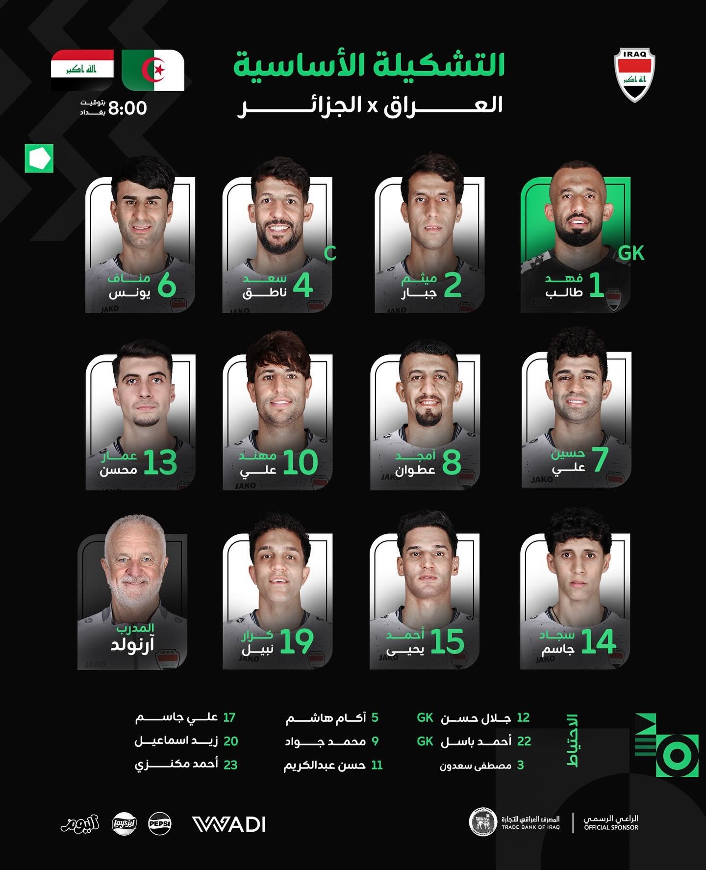 أعلن مدرب المنتخب الوطني، غراهام أرنولد، مساء اليوم الثلاثاء، ( 9 كانون الأول 2025 )، عن التشكيلة الأساسية للمنتخب التي ستخوض المواجهة المرتقبة أمام منتخب الجزائر، في الجولة الثالثة والأخيرة من الدور الأول لحساب المجموعة الرابعة في بطولة كأس العرب المقامة في قطر.
