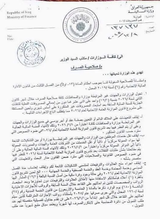 أظهرت وثيقة صادرة عن وزارة المالية، موجّهة إلى مكتب رئيس الوزراء وجميع الوزارات والجهات غير المرتبطة بوزارة، تحديد ضوابط صلاحية الصرف للعام 2025 استنادًا إلى أحكام المادة (13/ثانيًا وثالثًا) من قانون الإدارة المالية الاتحادية رقم (6) لسنة 2019 المعدّل، مع التأكيد على استمرار الإنفاق التشغيلي وفق السقوف المقررة في القانون وبما لا يتجاوز (1/12) من إجمالي المصروفات الفعلية للسنة السابقة لكل جهة، ولحين إقرار قانون الموازنة العامة الاتحادية لعام 2025.