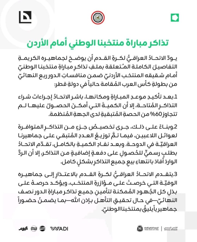 أصدر الاتحاد العراقي لكرة القدم، اليوم الخميس ( 11 كانون الأول 2025 )، بياناً يوضح فيه التفاصيل المتعلقة بتذاكر مباراة منتخب العراق أمام الأردن ضمن الدور ربع النهائي من بطولة كأس العرب المقامة حالياً في قطر.
