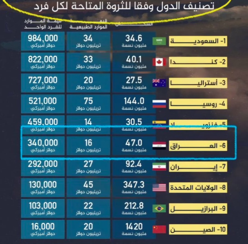 في ترتيب القائمة، تصدرت السعودية المشهد بحصة فردية تقارب 984,000 دولار، تلتها كندا 822,000 ثم أستراليا 727,000، وجاءت روسيا رابعا، وفنزويلا خامسا، ثم العراق سادسا، تليه إيران سابعا، فالولايات المتحدة ثامنا، ثم البرازيل تاسعا، والصين عاشرا. الفكرة هنا أن العراق، قياسا بعدد سكانه، يقف ضمن مجموعة دول تملك “رصيدا طبيعيا” كبيرا جدا، حتى إن فارق مرتبة أو مرتبتين في هذا النوع من التصنيفات يرتبط عادة بتغيرين حاسمين: حجم الموارد المقدرة، وحجم السكان.