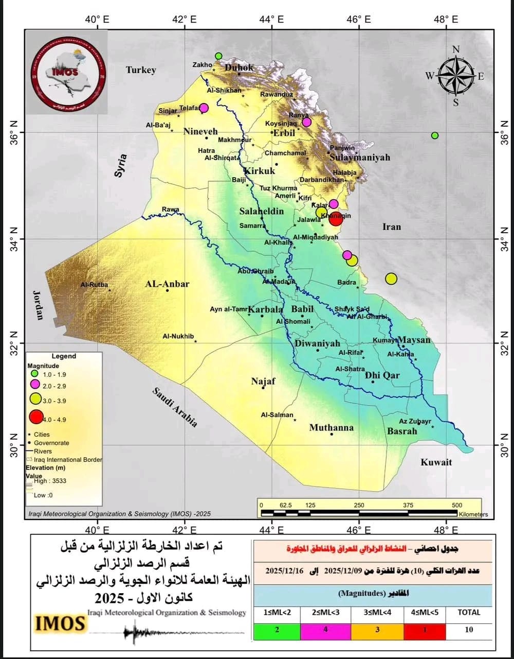 أعلنت الهيئة العامة للأنواء الجوية والرصد الزلزالي، اليوم الثلاثاء ( 16 كانون الأول 2025 )، تسجيل عشر هزات أرضية خلال الفترة الممتدة من 9 إلى 16 كانون الأول 2025، تراوحت قوتها بين 1.6 و4.5 درجات على مقياس ريختر.